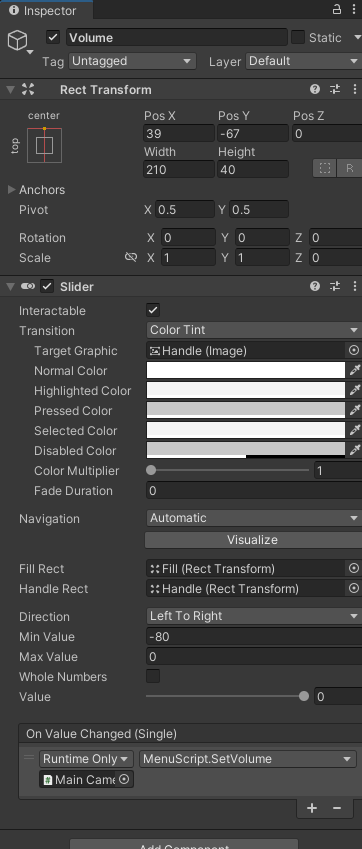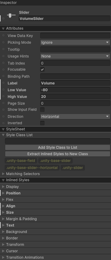 The screenshot 4 showcases the slider for the Unity User Interface and UI Toolkit. To implement the Unity User Interface, you’ll need to attach the Slider component to the game object. The slider’s transformation functions similarly to that in screenshot 2. It can trigger an event whenever its value changes, such as modifying the sound variable based on the current value. Likewise, in the UI Toolkit, the slider can register an event in C# scripting to perform actions related to the audio system according to the updated slider value.